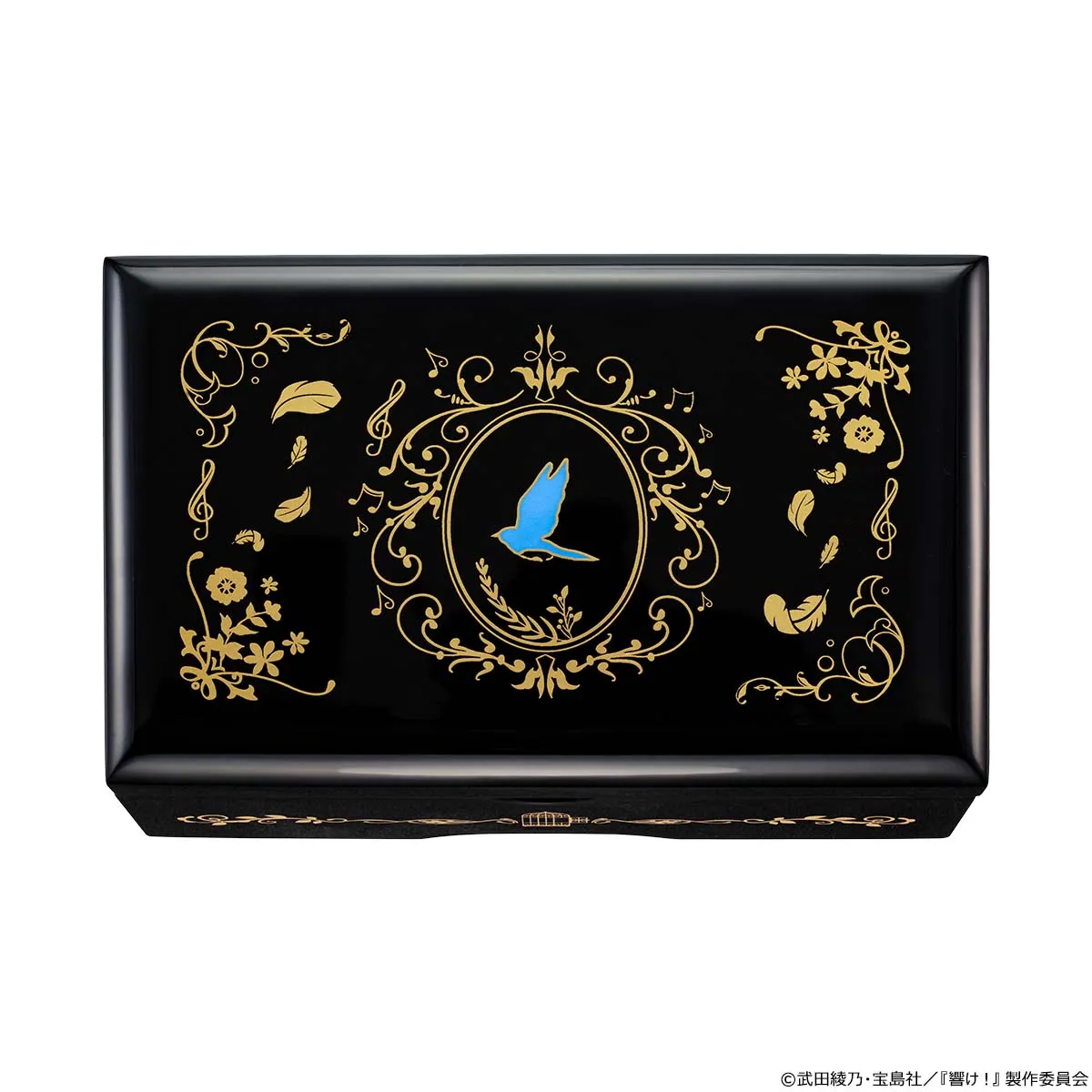 天面には青い鳥のシルエット。鳥の羽や草花のモチーフ、音楽記号をちりばめた華麗な金彩蒔絵で装飾されています。