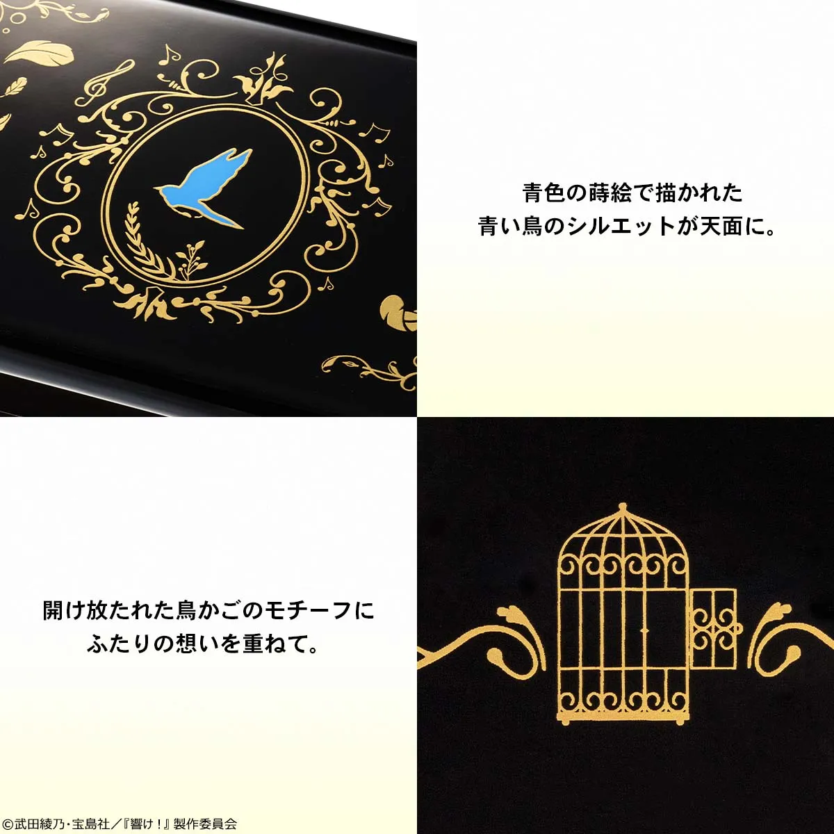 作中の絵本をイメージした草花の装飾や楽譜の音楽記号が金色の蒔絵で施され、天面には鮮やかな青色で色付けされた青い鳥が浮かびます。