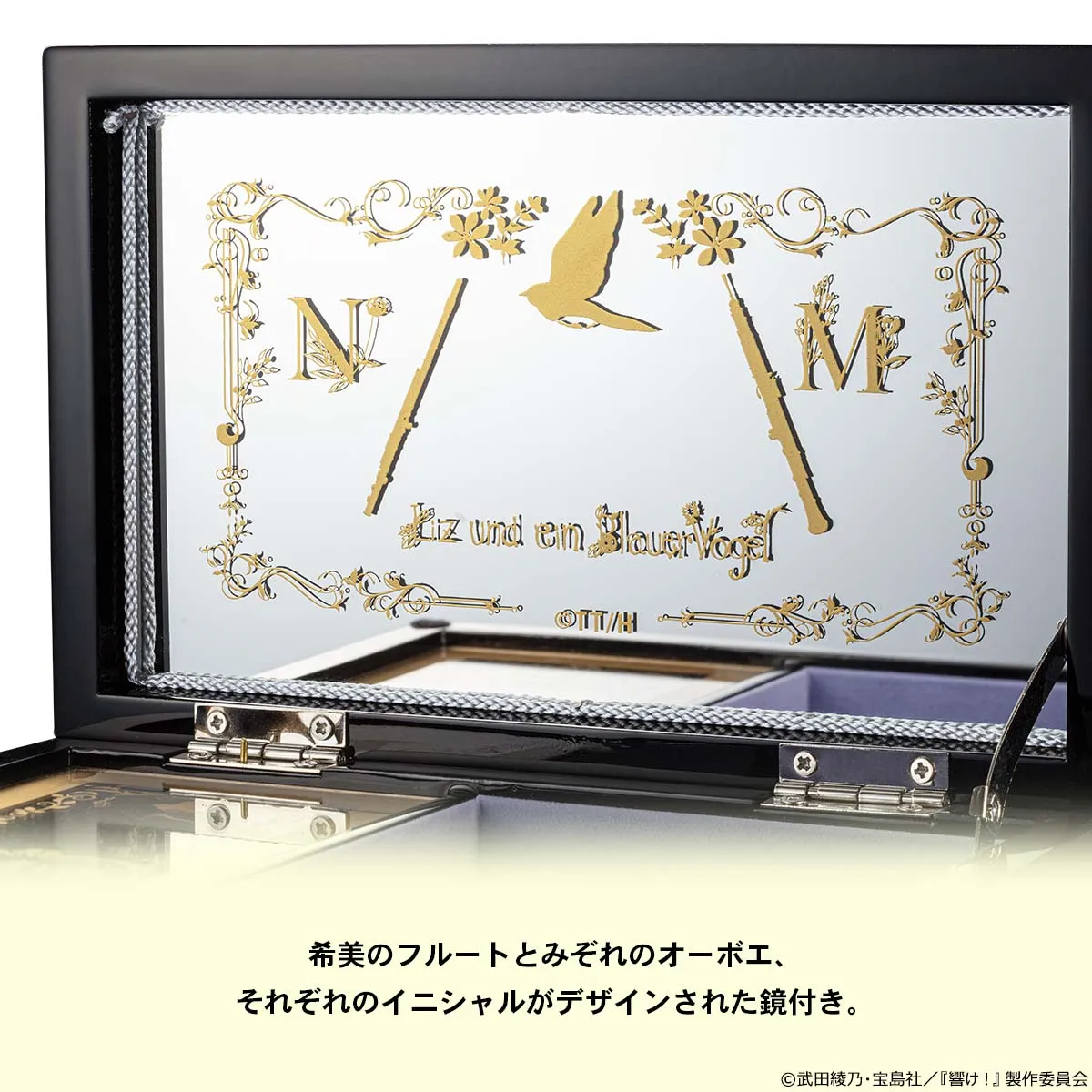 蓋を開けると現れる鏡には、希美のフルートとみぞれのオーボエとふたりのイニシャルが美しい装飾とともにデザインされています。