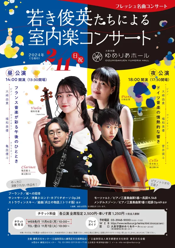 練馬文化センター(公益財団法人練馬区文化振興協会)は、2024年2月11日(日・祝)大泉学園ゆめりあホールにて「フレッシュ名曲コンサート 若き俊英たちによる室内楽コンサート」を開催いたします。昼公演、夜公演ともにチケット好評販売中です!
