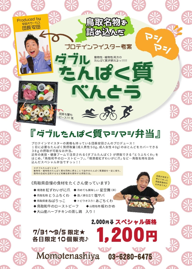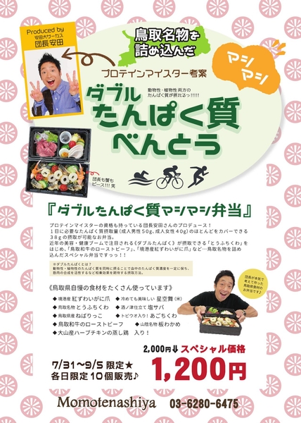 プロテインマイスターの資格をお持ちの団長安田さんが、鳥取県民のソウルフード「とうふちくわ」や肉質日本一の鳥取和牛などたんぱく質豊富な食材を使用したお弁当をプロデュース!好評につき期限を延長して販売中です。9月5日までの期間限定、1日限定10個の販売となりますので、ぜひお見逃しなく!