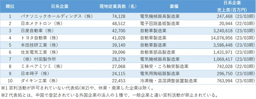 図表1 従業員数が多い中国日系企業ランキング