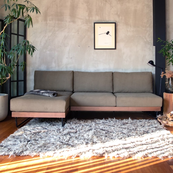 ソファの前にオットマンを合わせて足を伸ばせるカウチソファスタイルはもちろん、