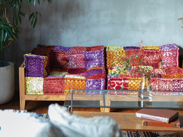 レッドやオレンジ、パープルといった明るい配色の幾何学模様が、インドの異国情緒溢れる風を感じさせます。