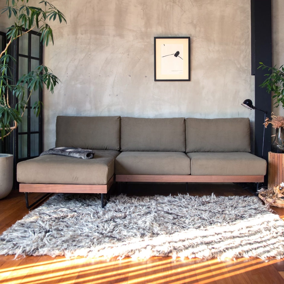 ソファの前にオットマンを合わせて足を伸ばせるカウチソファスタイルはもちろん、