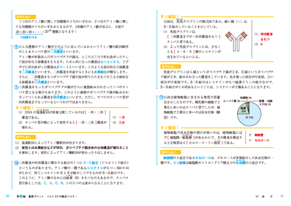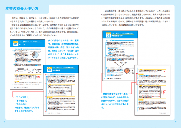 多くの内容のなかから、特に重要で、実験問題、思考問題に問われる可能性が高い内容、誤りやすい内容、理解しにくいテーマを第1編で40取り上げ、そこを集中的にマスターするように作成してあります。