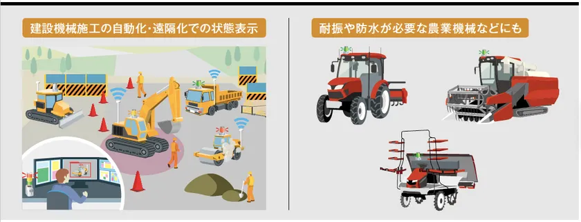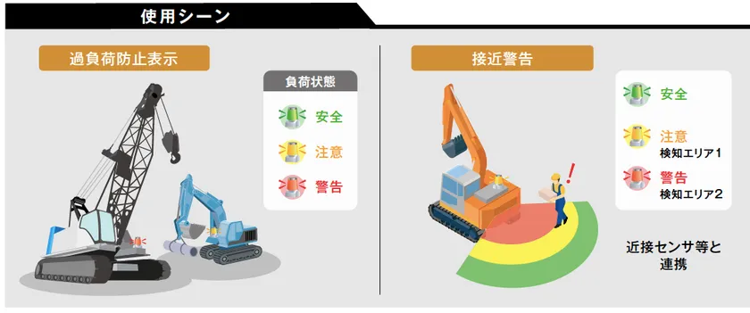 赤黄緑の3色発光で、クレーン作業の負荷状態の表示や、建設機械への接近警告の表示(近接センサ等との連携)などが可能