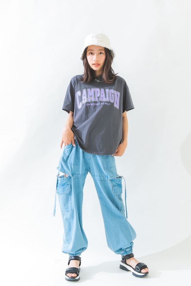 ゆったりとしたシルエットで着やすいデザインTシャツ。丸みをおびたガーリーなフォントのロゴで配色が可愛いデザインです。シンプルなデザインなので、着回し力も抜群です。