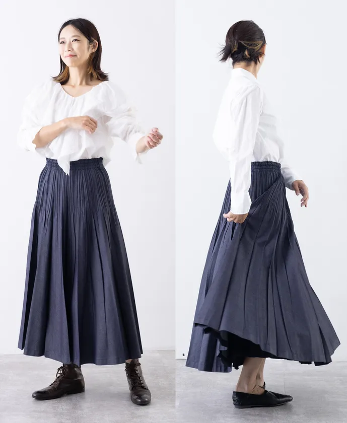美しく艶やかにずっと続く美形デニムプリーツ。腰回りすっきりなテクニックで驚きのシルエット。特許技術が実現した、洗っても取れにくいプリーツ。両面楽しめるリバーシブルで難く様々なシーンで大活躍できるアイテムです。