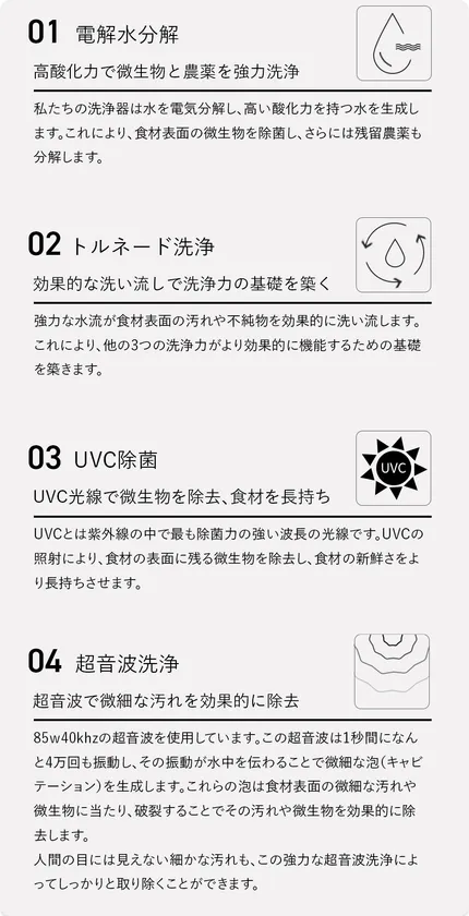 VERUSHは4つの強力な洗浄方法で食材をより安全、より新鮮にします。