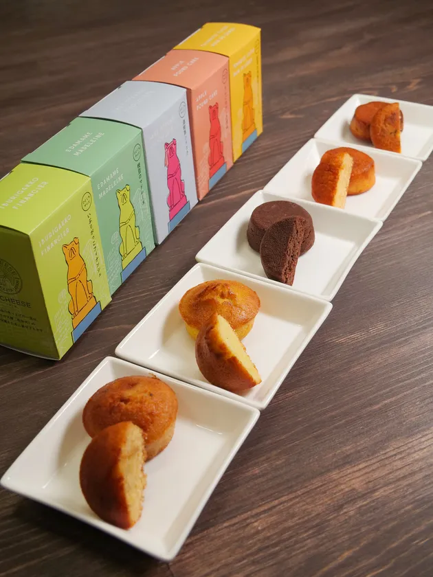 渋谷とハチのふるさと秋田を繋ぐスイーツブランド『HACHEESE(ハチーズ)』。「いぶりがっこフィナンシェ」、「枝豆のマドレーヌ」、「酒粕蒸ショコラ」、「りんごのケークポム」、「紅茶&米粉のパンドジェーヌ」のセット商品。いぶりがっこをはじめとしたハチのふるさと秋田の食材を使用したスイーツで、味のバリエーションも豊富。渋谷の街並みとハチが印象的なカラフルで可愛いパッケージデザインで、お土産に喜ばれること間違いなし。『HACHEESE』は、売上の一部がハチの犬種「秋田犬」の保存・保護のために寄付されます。