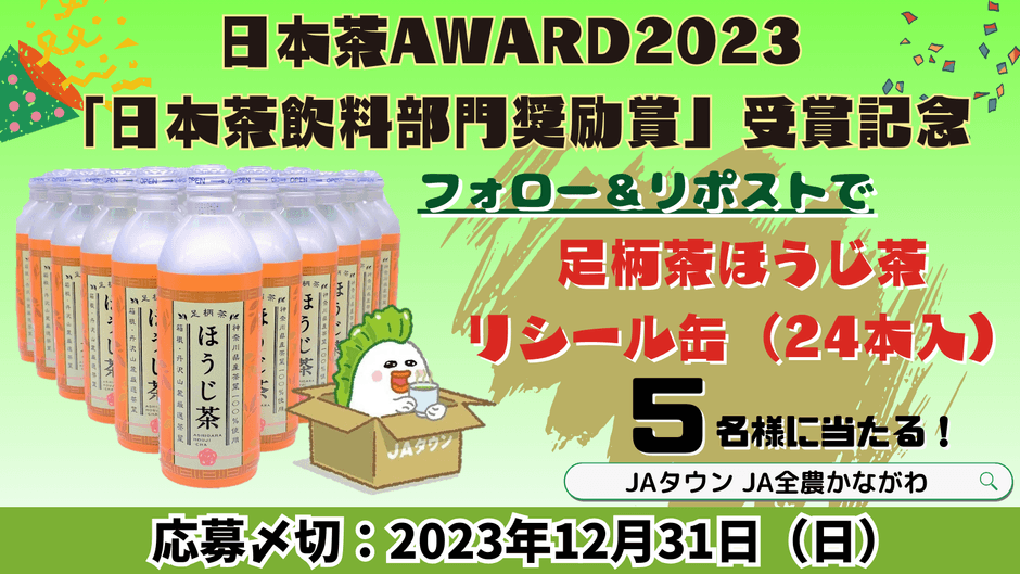 また、公式X(旧Twitter)アカウント「JAタウン【公式】」では、今回の受賞を記念して「足柄茶リシール缶ほうじ茶」が5名様に当たるプレゼントキャンペーンを実施します。