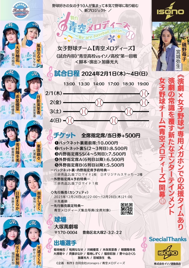 合同会社otonapro/青空メロディーズ 企画制作、女子野球チーム【青空メロディーズ】第一回戦 舞台『青空メロディーズ~We are baseball girls!!~』が2024年2月1日(木)~2月4日(日)に大塚萬劇場(東京都豊島区北大塚2-32-22)にて上演されます。