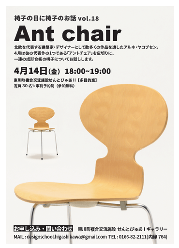 内容:北欧を代表する建築家・デザイナーとして数多くの作品を遺したアルネ・ヤコブセン。4月は彼の代表作の1つである「アントチェア」を皮切りに、一連の成形合板の椅子についてお話しします。