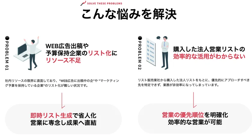 BtoBの営業を行なっている会社にとって、新規営業用のリストは必要不可欠となります。しかし、社内リソースを割いて手作業で時間をかけてようやく作成したリストや、購入した法人営業リストを元にアプローチをかけても予算保持企業に必ずしもアタックできるとは限りません。そのような「ムダな時間」をできる限り省き、顧客獲得における様々な問題を解決すべく『KaCHISUJI』の開発・提供を開始します。