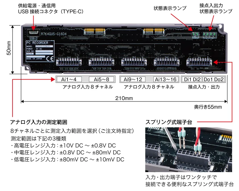 PCレコーダ(形式:R7K4GUS-G16D4)は、直流16点入力に加えてマイナスコモン(PNP対応)接点2点入力、フォトMOSリレー2点出力に対応しています。パソコン側のUSB Type-Cポートから電源供給できるため電源が不要です。ACアダプタが不要で、コンセントを探す必要もないため、タイプテストのデータ取りなど、場所を限定せずご使用いただけます。