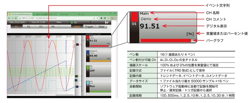 ページあたり4ペンのトレンド画面を4ページ分表示します(合計16ペン)。各ペンには全入出力チャネル(Ai/Di/Oi/Do)が割付けられます。アナログ入力信号(Ai)と演算入力信号(Oi)には、領域名称、表示色、イベント文字列、警報出力、領域タイマ、トリガ、リセットを設定できます。