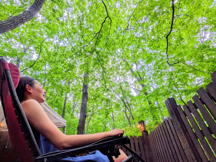 人気の秘訣は、森の中に浮かぶような感覚で360度の森林ビューが堪能できる露天風呂とリラックススペース。