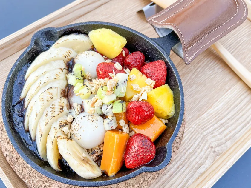 熱さと冷たさを同時に楽しめる、フルーツたっぷりの新感覚ホットスイーツです。温かいアサイーの下にはヘルシーなグラノーラが敷かれており、白玉も載っているので見た目よりもボリュームがあります。