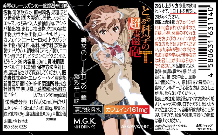 御坂美琴の優しさをイメージした“白桃の香り”と、レールガンの威力をイメージした“辛口の唐辛子味”の、甘い香りなのに辛いという新しいカフェイン栄養ドリンクです。