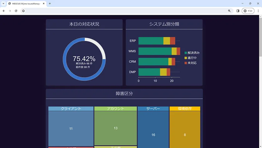 また、Wijmoの操作感を無償で体験できるWebサンプルにおいて、課題の対応状況を可視化するダッシュボードのアプリケーションを新たに追加しました。サンプルアプリケーションに触れることで、Wijmoに収録されているチャートやゲージ、リストなどのコントロールを組み合わせた実用的な業務アプリケーションをイメージすることができます。