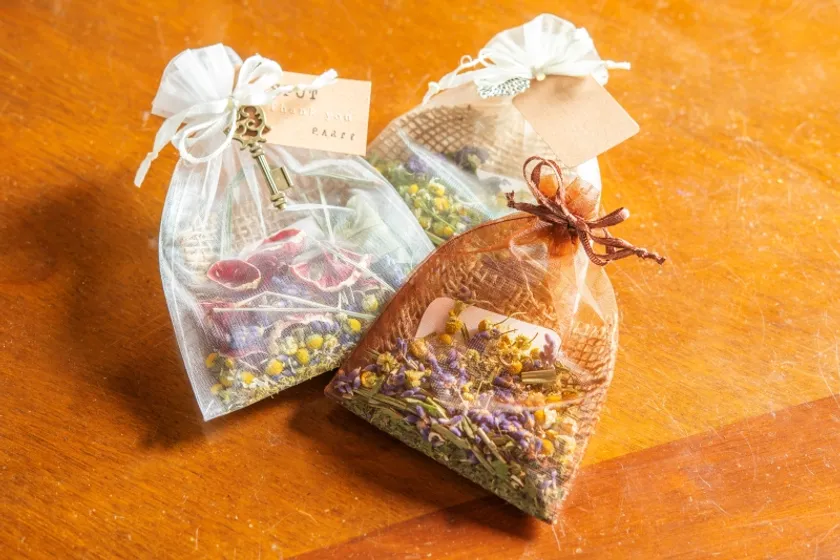 ゆったりハーブティーを飲み、ハーブと精油の話を聞きながら、直感で好みのハーブを選んでサシェ(フレグランス)を作ります。お友達との参加も大歓迎です。