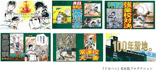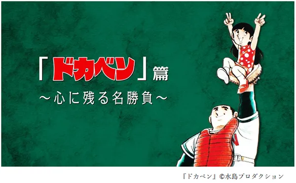 名作野球マンガ9作品のうち、野球マンガのレジェンドとも呼べる「ドカベン」篇は、水島プロダクション全面協力のもと、連載当時の雑誌や原画集から貴重なカラー素材をふんだんに使用した映像でドカベンが蘇ります。神奈川県大会の激闘から、甲子園で凌ぎを削った各地方のライバル校との戦いまで、心に残る名勝負の数々を通じて、甲子園にも思いを寄せていただけます。