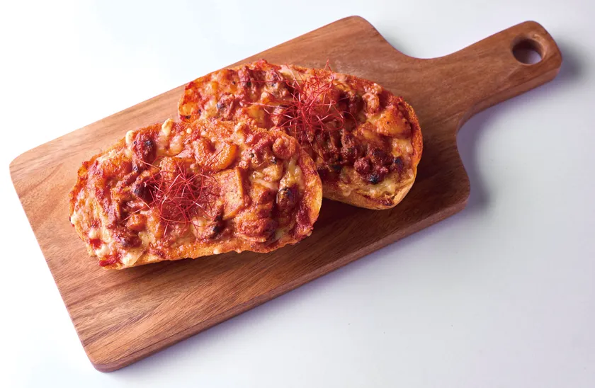 スライスしたバゲットにニンニク仕立ての旨辛ソースを和えた魚介をトッピング。