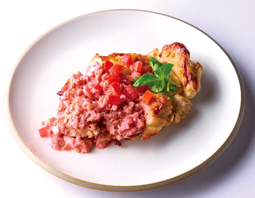 麹漬けチキンと梅肉入りの赤いタルタルが相性抜群。