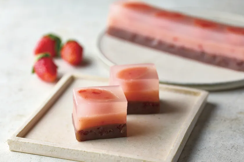 小倉のういろに、いちごのういろを重ね、透き通るような葛のういろに可愛らしいいちごの型抜きを浮かべた一品。