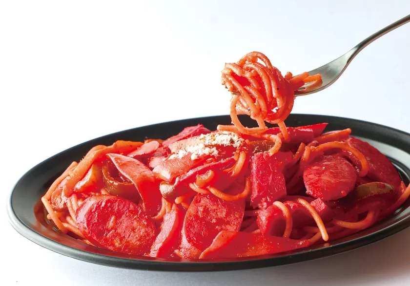 一味唐辛子を使用したピリ辛ナポリタン。