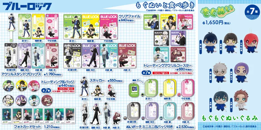 キャラクターたちがもぐもぐしているぬいぐるみこと「もぐぬい」と一緒に好きなごはんを食べ歩く!新規ビジュアル「もぐぬいと食べ歩き」シリーズの商品が新登場!潔 世一、蜂楽 廻、千切 豹馬、凪 誠士郎、御影 怜王、糸師 凛、糸師 冴の7キャラのラインナップが楽しめます。