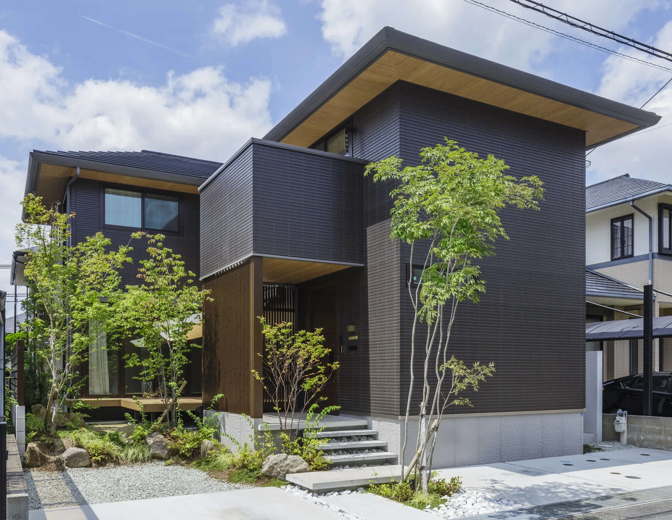M様邸は、広大な住宅地に佇む一軒家で、中庭を囲む2階建てのコートハウスです。外観は、チャコール色のベルバーンと寄棟屋根が調和し、洗練された雰囲気を醸し出しています。