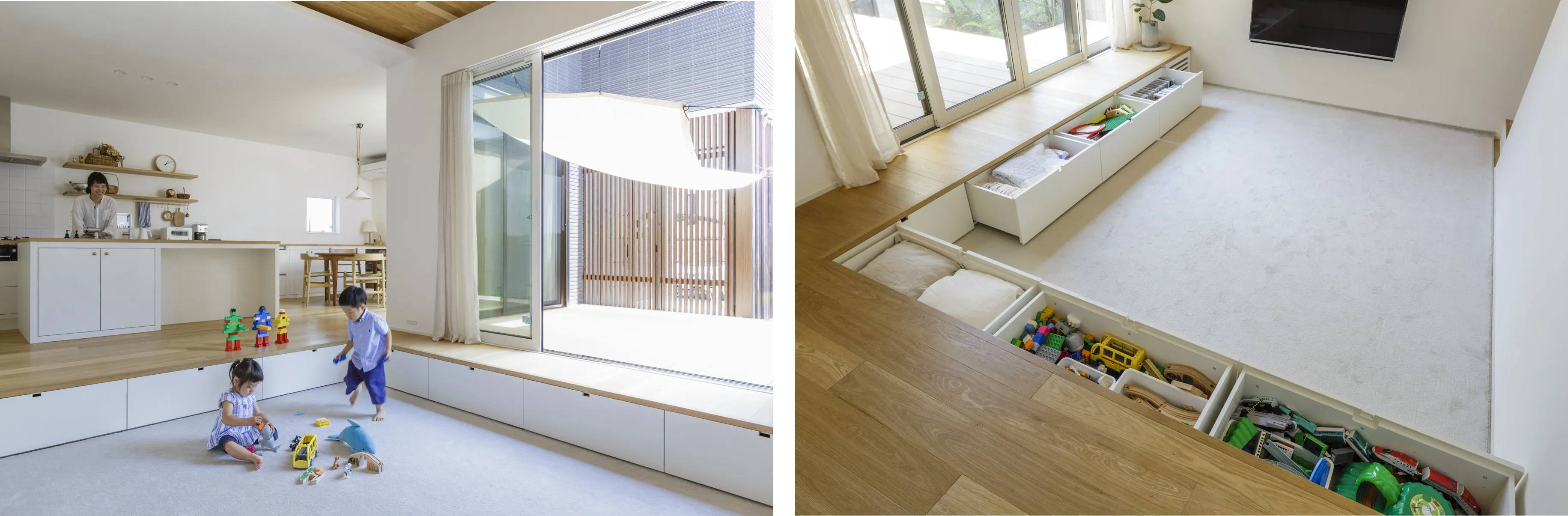 リビングは、ダイニングとキッチンより目線を1段下げたピットリビング。実はこのピットリビング、段差部分が全て引き出しになっているのです。7杯分の引き出しを確保した大容量の収納には、おもちゃ、おむつ、DVDやゲームソフトなど、子どものものを中心にたっぷり収納しています。