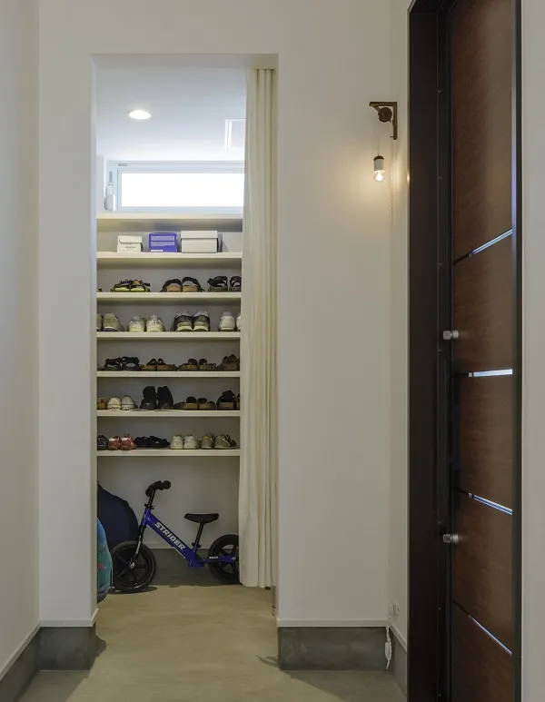 カーテンで仕切った土間収納には靴やアウトドア用品などを収納