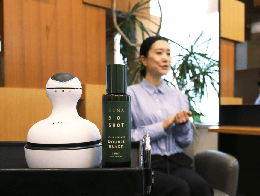 SUNAスカルプエッセンスはとにかく毎日継続して使用することが重要です。RIORESのヘッドスパリバイヴで清潔かつ柔軟な頭皮にして、SUNA スカルプエッセンスでお手入れする。これをひとつの生活習慣として取り入れることで、ルーティーンにしやすくなるので、併せて使うというのはとてもいいと思いますよ。」