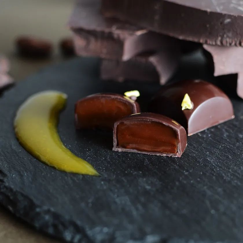 パッションフルーツのガナッシュ。パッションフルーツのまっすぐな酸味に加え、てんさい糖をキャラメリゼしたコクと苦み、厚みのある味わい。