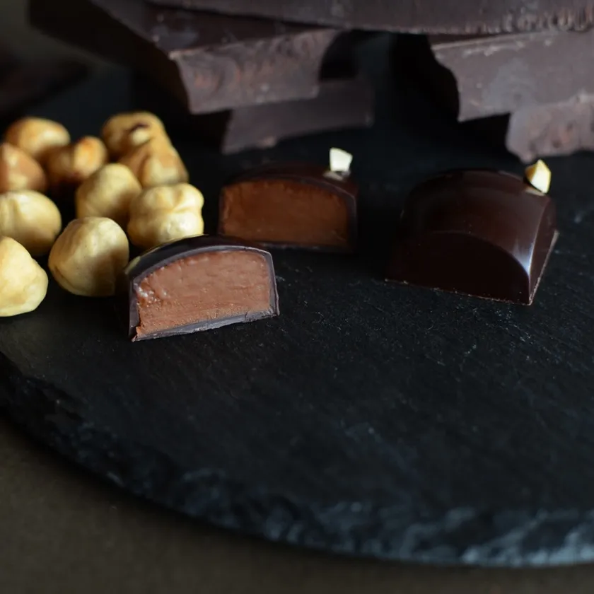 自家製ヘーゼルナッツプラリネを使用した至極のひと粒。ナッツの甘みを残しつつ、ロースト感、キャラメル感が口いっぱいに広がるリッチな余韻。