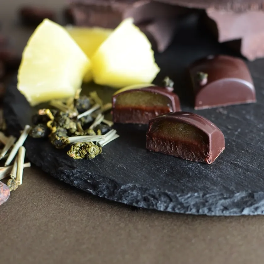 パイナップルをベースにしたジャスミン茶と東ティモールレモングラスのガナッシュ。味わいの変化が楽しめるフローラルでフルーティーな仕上がり。