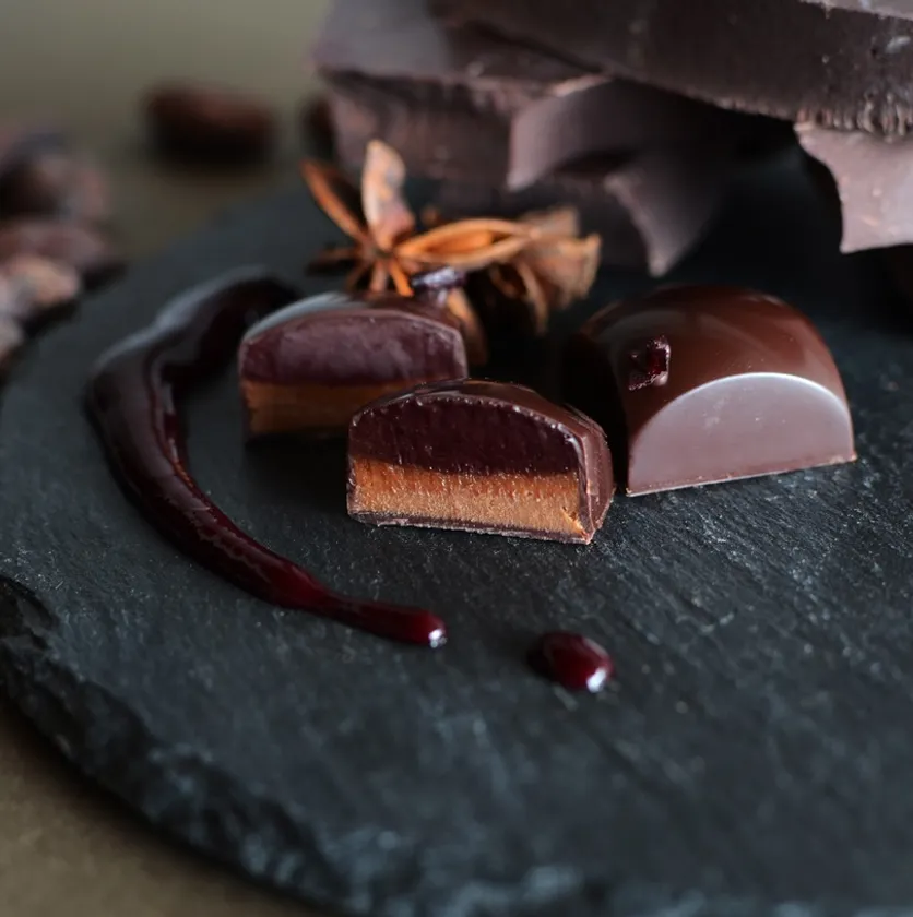 八角と自家製ヘーゼルナッツプラリネを活かしたカシスのガナッシュ。八角のほの甘くてスパイシーな香りのプラリネとカシスの酸味をマリアージュ。