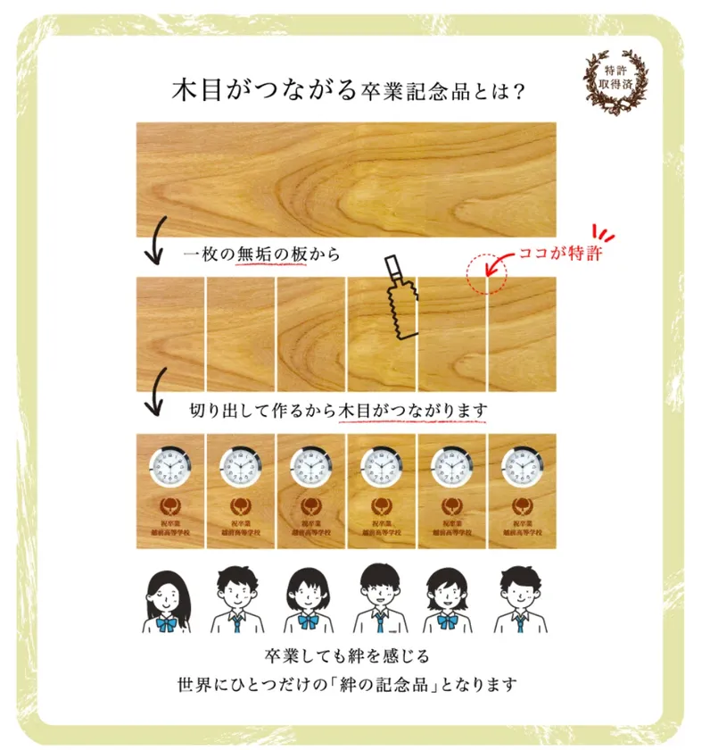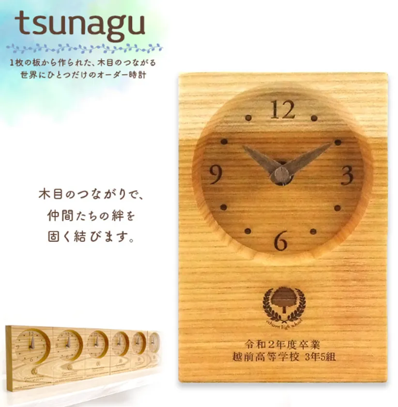 注文した時計を並べると木目がきちんとつながるようになっているため、「これから離ればなれになっても心はつながっている」というメッセージを伝えたい卒園・卒業・卒部の記念品として贈呈するのに最適です。