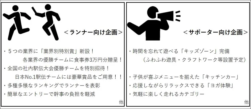 「企業対抗駅伝2024」は、大会テーマに“走っても走らなくても楽しい!子供も楽しい!”を掲げ、企業のチームはもちろん、応援に来た子供や家族、同僚も楽しめるコンテンツを多数取り揃えます。