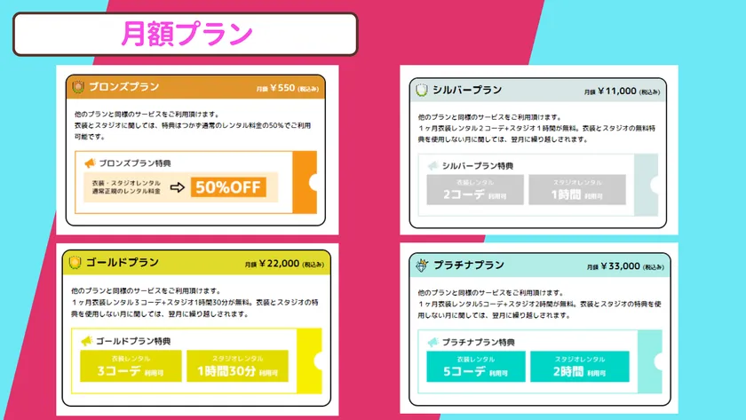 ・衣装レンタルが真毎月2~5コーデ無料で借りられます。