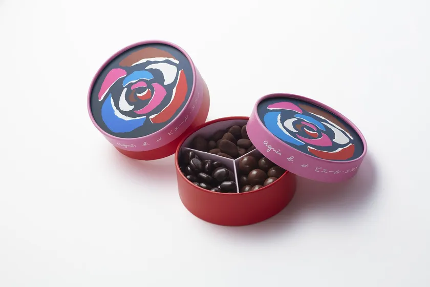 アニエスベーでは2024年2月1日(木)より、Made in ピエール・エルメの「フルーツ&ナッツのチョコレート」を、バラをちぎり絵で表現したスペシャルボックスにて販売いたします。