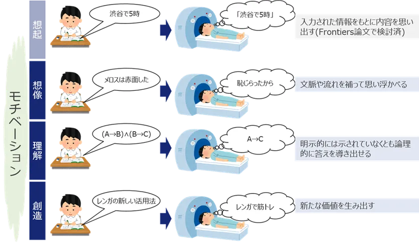 本プロジェクトでは、既に検証された手書き入力された情報をもとに内容を思い出す「想起」に加えて、文脈や流れを補って思い浮かべる「想像力」、明示的には示されていなくとも論理的に答えを導き出せる「理解力」、そして新たな価値を生み出す「創造力」について取り組みます。また、モチベーションなどの非認知的能力についても着目します。さらに、手書きはこれらの能力にどのような影響をもたらすのか、脳科学的および心理学的な検証を行ってまいります。