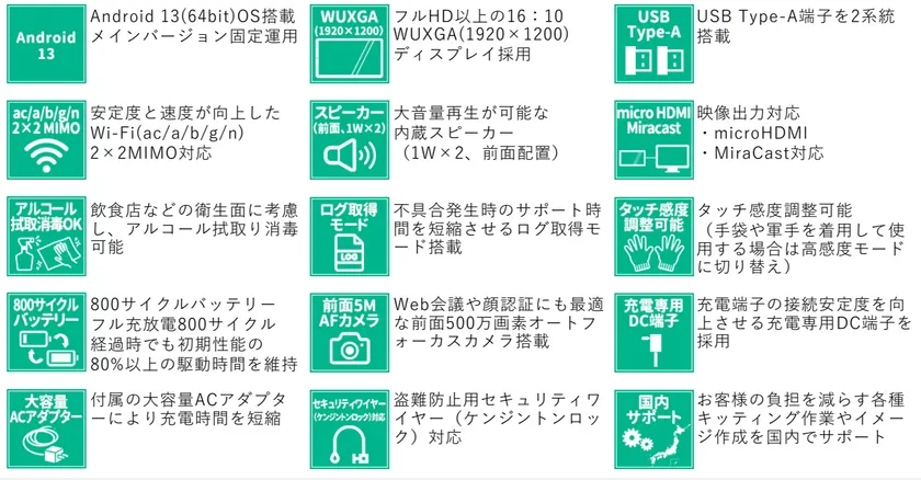 本機は、業務用途に特化したスタンダードタブレットとして2019年より長らくご愛顧いただいた「TA2C-M8」の後継機種で、OSにAndroid 13を搭載し、動作パフォーマンスをTA2C-M8と比較して約70%向上* させたハイパフォーマンスモデルです。