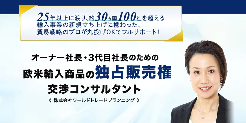 株式会社ワールドトレードプランニング(本社:横浜市中区/代表取締役:大久保 佳代子)は、2024年1月18日より、日本全国の中小企業オーナー社長・3代目社長を対象に、日本初&唯一無二の輸入商品で利益の最大化を実現する、独占販売権交渉コンサルティングサービス「Trade for You」を全国で展開いたします。これまで欧米輸入商品で、わずか4年間で売上が2億円から7.7億円に385%アップした実績を元に、コロナ禍以降、新たな収益確保が急務の中小企業に対し、欧米直輸入による課題解決策を提案してまいります。