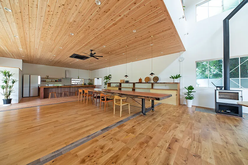 イベントが開催される会場は、無垢材や漆喰などの自然素材にこだわり住む人に寄り添った設計を行う宇治の工務店「ITAYA KOBO」のショールーム。木の香りが心地いい古工場をリノベーションした広々空間にはイートインスペースを設置。約6mの一枚板テーブルは圧巻で一見の価値あり!屋内にある薪ストーブの美しい炎を眺め身体の芯から暖まりながらフードをお楽しみいただけます。屋外は宇治の山々を望む自然いっぱいの庭スペースで多数の出店を予定。ベンチ近くに薪ストーブを設置しているので、屋外でも炎を眺めて癒されること間違いなし。ITAYA KOBOスタッフにお声がけいただくと新築注文住宅やリノベーションなどのお家相談も可能です。