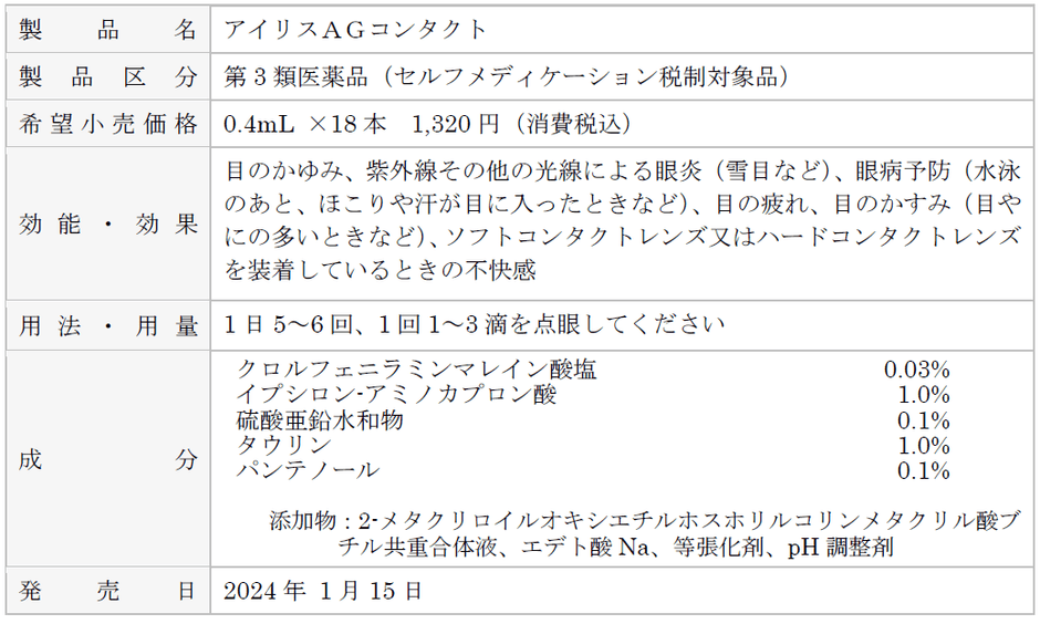 大正製薬株式会社[本社:東京都豊島区 社長:上原 茂]は、ソフトコンタクトレンズをしたままでも使える、つらい目のかゆみに効果のある目薬「アイリスAGコンタクト」を1月15日(月)より、全国のウエルシアホールディングス※1にて新発売いたします。