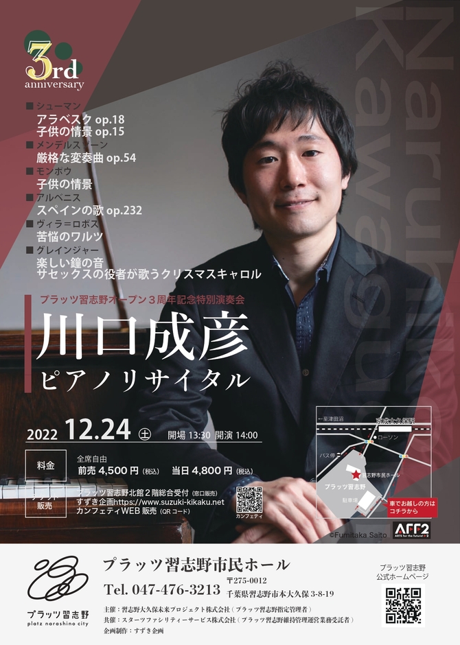 『川口成彦ピアノリサイタル』が2022年12月24日(土) に習志野市民ホール(プラッツ習志野)(千葉県習志野市)にて開催されます。チケットはカンフェティ(運営:ロングランプランニング株式会社、東京都新宿区、代表取締役:榑松 ⼤剛)にて11月1日(火)より発売開始です。